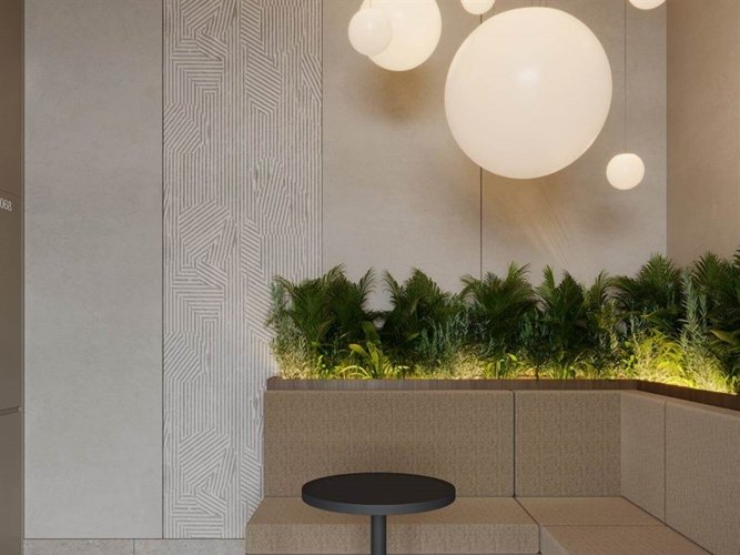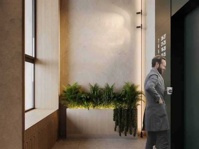 Арт-пространство «Возрождение» с фигурой мамонта объединяет историю края и современный комфорт. Дизайнерские лобби в природных тонах продолжают концепцию эко-стиля, а приватная терраса на стилобате создана для отдыха с видом на реку.