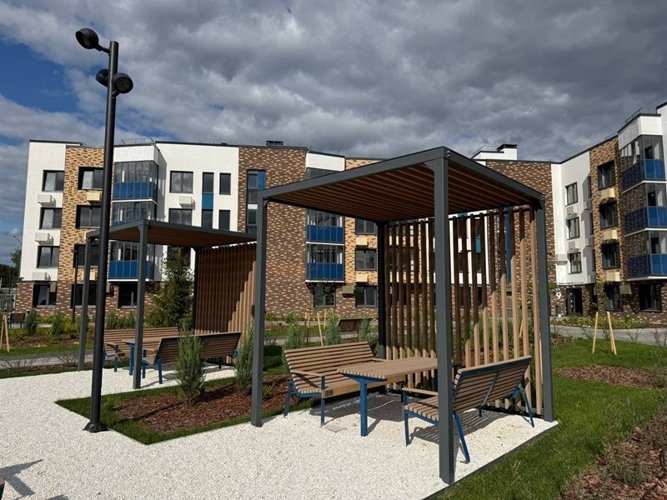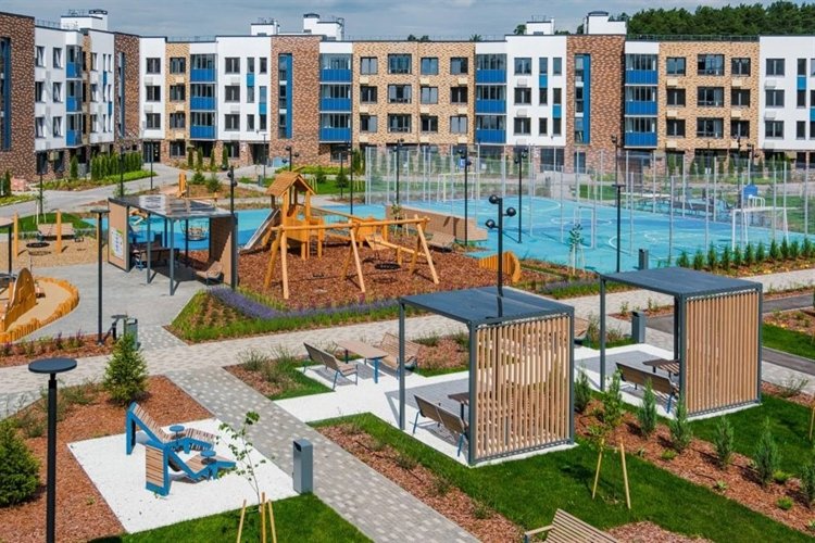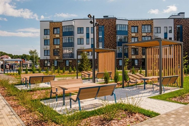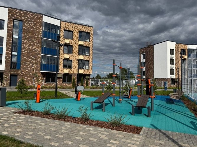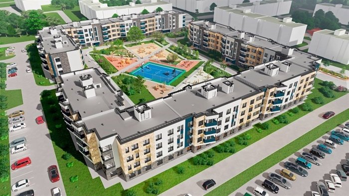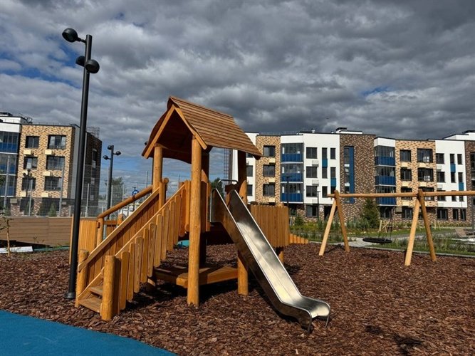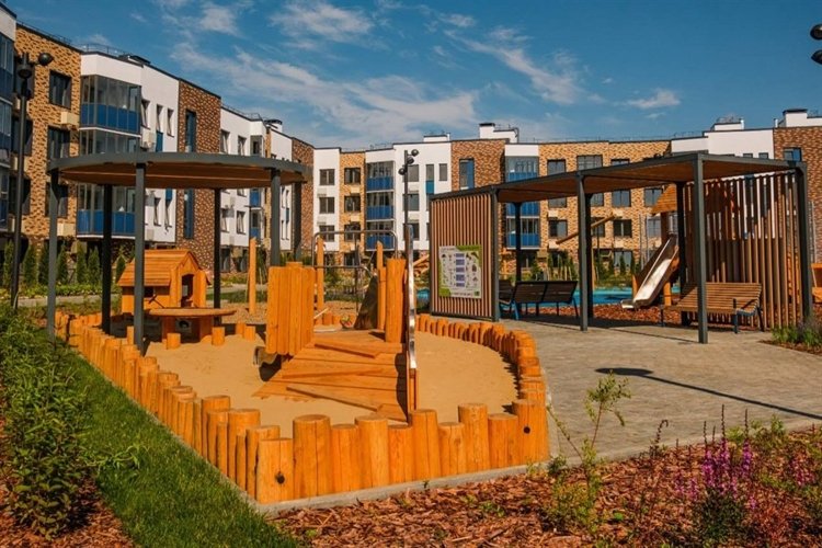 Зонированный двор объединяет развивающие площадки для детей, воркаут-зоны для спорта и уютные локации для отдыха.